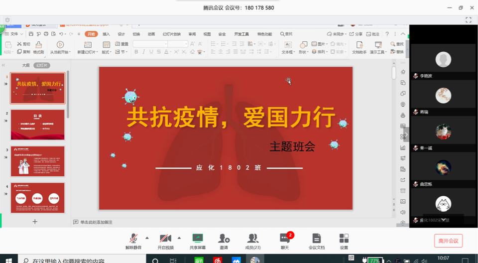 2020年3月15日上午10时,tyc1286太阳成集团应用化学1802班的同学们召开了新学期以来的第一次班会。此次班会以“共抗疫情,爱国力行”为主题。受疫情影响,此次班会以线上直播形式召开,由班长刘思铭主持。
