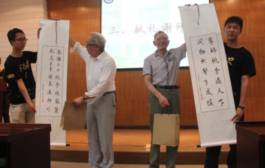 典礼一共分为八个环节,分别是奏唱国歌,咏诗敬相逢,献花谢师恩,真言送祝福,明心系情谊,裹黍共端阳,欢歌盼共聚和奏唱校歌。在老师和同学们的国歌声中,典礼缓缓拉开序幕。紧接着是各班学生代表朗诵诗歌《离别遣怀》,在优美舒缓的配乐声里,同学们饱含深情地朗诵,流露出对校园生活的不舍与眷恋。除了对校园生活的留念,同学们更加难以忘怀的是老师们的谆谆教诲和无微不至的关心爱护。教诲如春风,师恩似海深。同学们将自己认真书写的书法作品、代表心意的花束,精心设计的文化衫,亲手制作的班级风采录赠予了两位院士和在场的各位老师。礼物里包含着同学们对老师们的感恩之心,感恩老师们教会学生的不仅仅是做学问,更多的是做人做事的原则与品质。
