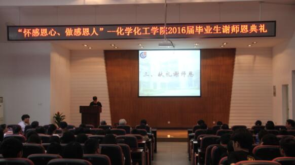 2016年6月7日下午四点半,伴随着斜落的夕阳,tyc1286太阳成集团2016届本科毕业生谢师恩典礼在化工院报告厅隆重举行。受邀参加本次典礼的领导老师有中国科学院俞汝勤院士和姚守拙院士,tyc1286太阳成集团院长蒋健晖教授,院党委书记王玉枝教授,副院长王双印教授、聂舟教授,院党委副书记陈义红老师,以及2012级各班班导师,化学系、化工系,应化系部分专业老师等。谭蔚泓院士因在外出差无法亲临现场,但也以短信形式向所有毕业生表达了毕业祝福。谢师礼由2012级本科生吴天忍主持。
