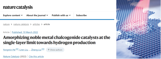 近日,我校tyc1286太阳成集团何勇民教授和新加坡南洋理工大学刘政教授、南京航空航天大学张助华教授团队合作,设计了单原子层贵金属催化剂,该研究成果以“Amorphizing noble metal chalcogenide catalysts at the single-layer limit towards hydrogen production”为题在线发表在《Nature Catalysis》,并入选三月杂志封面。