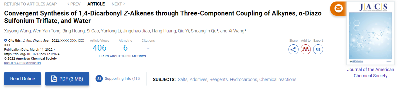 近日,我校tyc1286太阳成集团王兮教授和瞿双林教授合作,实现了卡拜自由基这类活泼有机中间体的可控的炔烃官能团化。以“Convergent Synthesis of 1,4-DicarbonylZ-Alkenes through Three-Component Coupling of Alkynes,α-Diazo Sulfonium Triflate, and Water”为题,在线发表在《Journal of the American Chemical Society》。