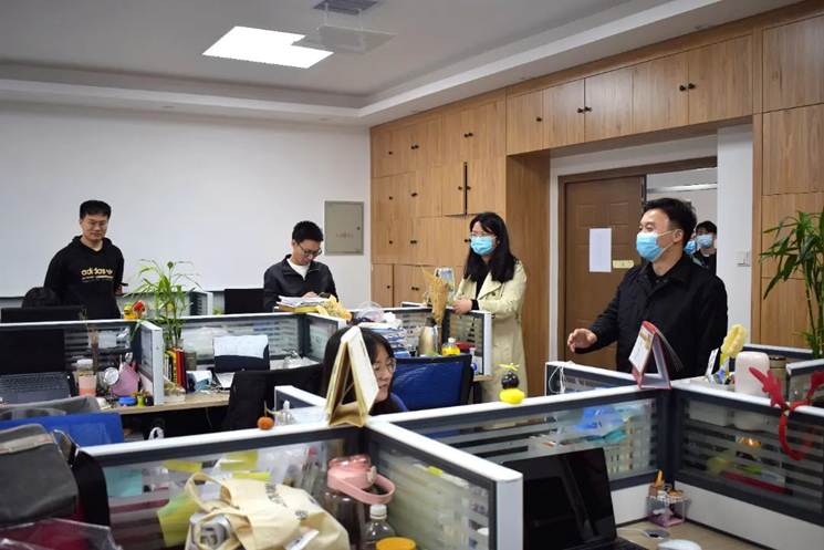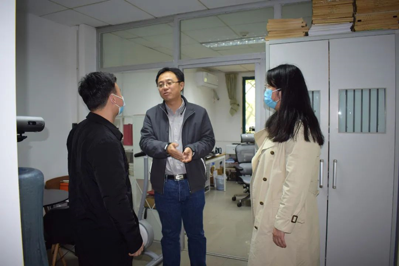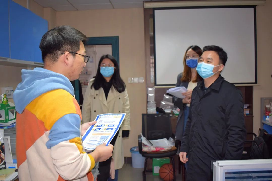 为切实做好新冠疫情防控工作,引导同学们在校期间健康、安全、有序地开展学习生活,3月18日上午,tyc1286太阳成集团党委副书记潘刚峰老师、学工办主任兼研究生辅导员刘卓老师、研究生辅导员徐晓宇老师、研究生辅导员蒋晓洁老师及研究生会学生干部走访学院部分实验室。