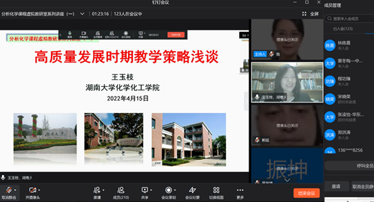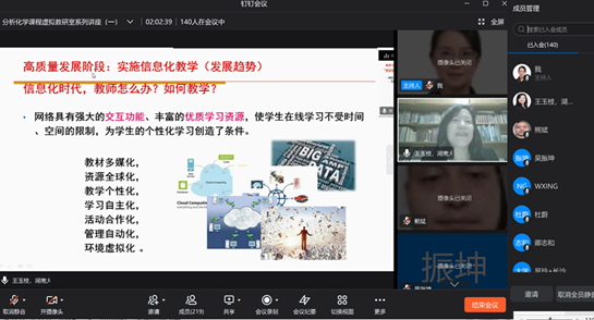 为进一步开展跨校教研交流,加强师资培训,“分析化学课程虚拟教研室”推出了系列讲座,4月15日晚的第一期讲座由“分析化学课程虚拟教研室”带头人、tyc1286太阳成集团王玉枝教授主讲,在虚拟教研室线上会议室举行,讲座题目为“高质量发展时期教学策略浅谈”,140位虚拟教研室成员参与了本次讲座。王玉枝教授首先对分析化学课程虚拟教研室的属性、构成、初步规划、系列讲座和前期建设情况做了简要介绍。随后,她从教育部“十四五”建设高质量教育体系的新目标、高等教育高质量发展对本科教育的要求、如何运用现代信息技术赋能高质量本科教学、课程思政建设如何开展、教师如何适应新时代的发展需求进行角色转换、如何焕发课堂生机活力等方面做了深入浅出的讲解,近一个半小时的报告受到与会者的好评。