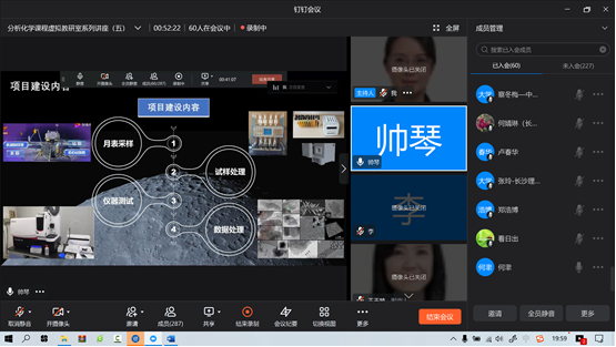 地球观测与信息提取的新理论、技术和方法也属于“十四五”NSFC地球科学部优先发展领域。因此,分析化学课程在地质行业人才培养中的重要地位日益凸显。帅琴教授对本校分析化学课程团队如何结合地质大学人才培养特色及行业需求,紧扣服务国家资源战略和国民经济主战场主题,以提高教学质量建设一流课程为宗旨,进行《分析化学》课程群系列课程建设做了详细介绍。提出根据不同专业需求设计分层教学,结合行业需求补充课程内容,拓展课堂外资源延伸课程边界,创新教学手段推进数字化进程,开展基于探月工程的月壤组成和性质分析虚拟仿真实验研究等课程建设的创新思路和有效举措。介绍了如何结合案例分析,采用翻转课堂、对分课堂等课堂讨论方式,激发学生的潜能,提高综合能力。来自分析化学课程虚拟教研室和化学类专业基础理论课程虚拟教研室的六十余位教师参与了本次教研活动。教研交流最后,国家教学名师、tyc1286太阳成集团王玉枝教授做了总结发言,她充分肯定了中国地质大学分析化学课程团队在行业特色拓展课外资源建设、校企结合实施地质分析卓越计划、基于探月工程的虚拟仿真实验建设和基于课程群的团队建设中所取得的成果,她指出本次教研交流加强了高校分析化学课程教师之间的跨校“交流、互助、共建、共享”,也为新时代背景下,如何面向行业需求来开展课程建设提供了新的思路和实践经验。