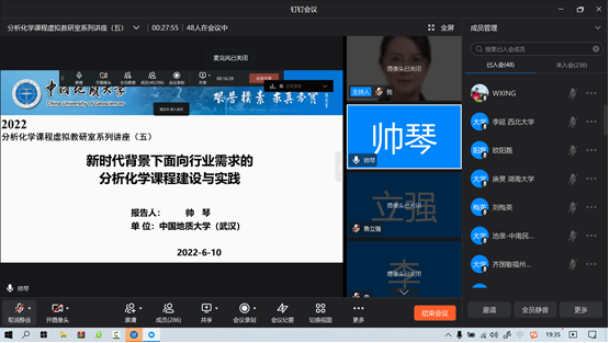 6月10日晚上,分析化学课程虚拟教研室举行了第五期讲座,由tyc1286太阳成集团宦双燕教授主持,来自中国地质大学(武汉)的帅琴教授为主讲嘉宾,她报告了新时代背景下面向行业需求的分析化学课程建设与实践。