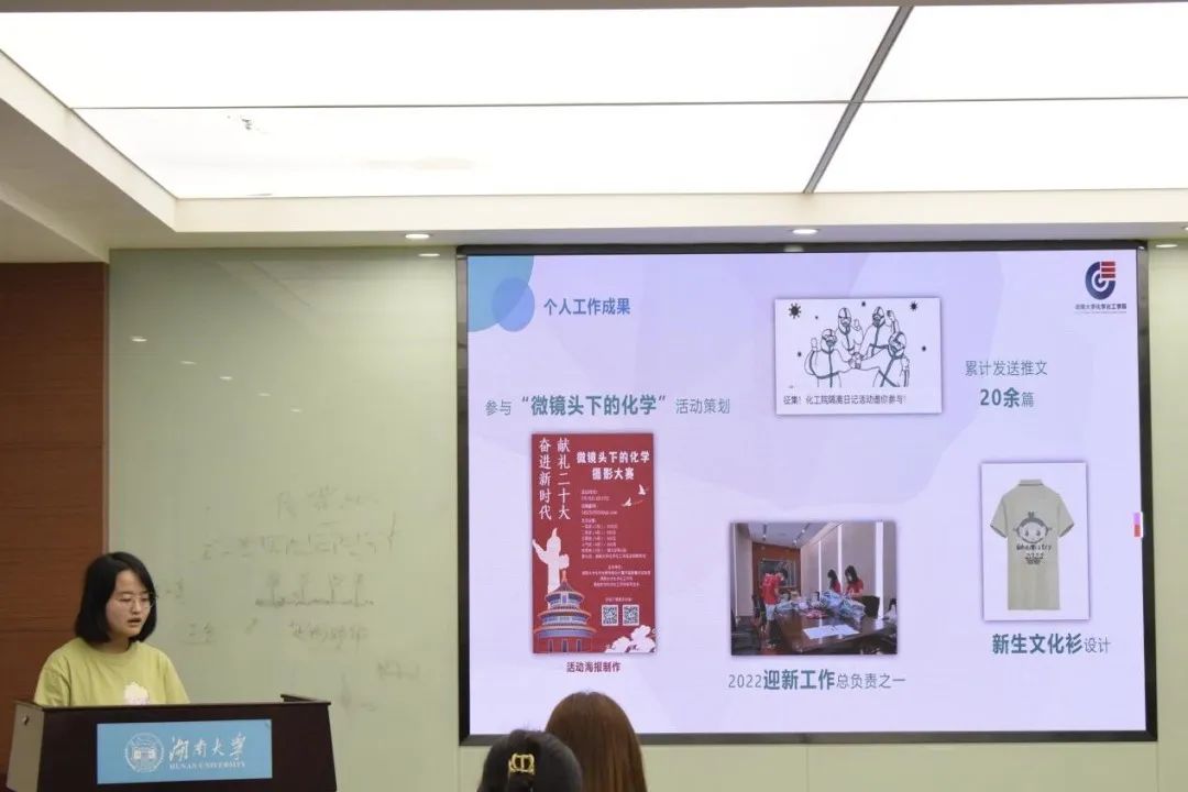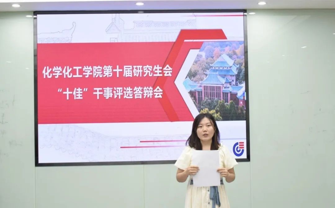 为表彰在2021-2022年度工作表现优秀、综合素质突出的研会干事,激励同学们在新一年继续力争上游,增强内部凝聚力,tyc1286太阳成集团研究生会于2022年8月30日下午在新化工楼B座106会议室举行第十届研究生会“十佳”干事评选答辩会。本次大会由第十届研究生会主席团吴杰星主持,2021级研究生辅导员兼分管研会工作蒋晓洁老师、化工院研会全体同学参加。