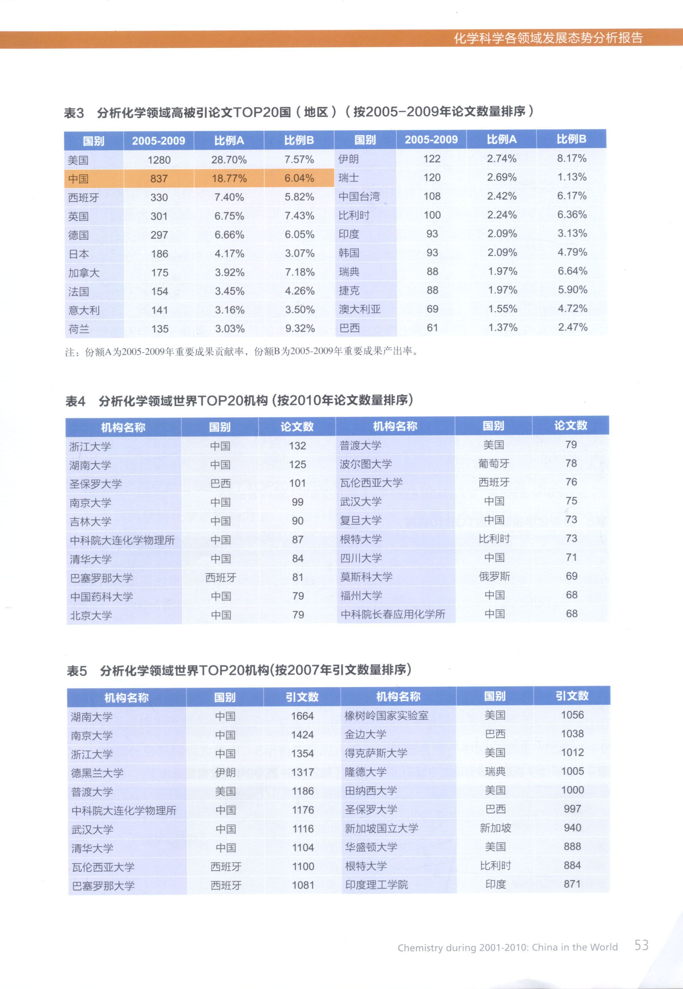 根据该报告中评估结果显示,我校分析化学学科在分析化学领域世界TOP20机构按2010年论文数量排序位居世界第二位,按2007年引文数量排序位居世界首位,在其它几项排名中也分列国际和国内前茅(见以下图表)。这一国家层面上的评估结果充分显示我校分析化学学科科研竞争力已进入到世界一流水平行列。