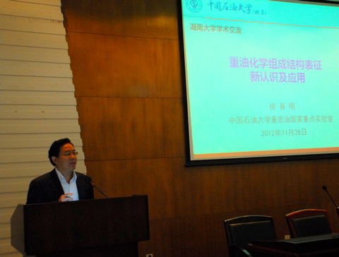 11月28日,应国家重点实验室和学院邀请,中国石油大学(北京)、国家杰出青年基金获得者徐春明教授和中国石油大学(北京)赵振教授来我院作学术讲座,分别作了题为“石油化学组成表征新认识及应用”“石油燃料加工与利用过程中的环境催化”的学术报告,受到广大师生的热烈欢迎,何晓晓教授主持学术报告。