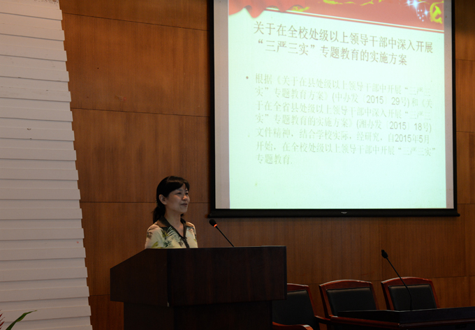 会议由学院党委副书记陈义红老师主持,党委书记王玉枝教授为全体与会人员讲授党课。王书记分别从学校的总体要求、方法步骤以及“三严三实”的内涵等方面展开此次党课培训。王书记强调,各位党员一定要聚焦对党忠诚、个人干净、敢于担当,加强党性修养,坚持实事求是,改进工作作风,着力解决“不严不实”问题。同时,要认真开展专题教育活动,采取自学与集体学习相结合的方式,以专题民主生活会和组织生活会等为载体,深入开展“三严三实”专题教育。随后,王书记结合学院日常工作实际,向大家解读了“三严三实”的具体内涵。要求各位领导干部和党员同志要以“严”的要求、“实”的作风,把专题教育活动组织好、开展好;要牢记“三严三实”的要求,恪尽职守,率先垂范,推动作风建设取得新成效,努力为学院和学校的发展建设提供新动力。