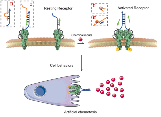 细胞行为的精确控制是目前细胞治疗技术中的难点和热点问题。现代合成生物学手段通过基因工程技术对细胞膜表面受体的分子识别特异性进行改造,实现细胞行为调控。然而,对细胞的遗传操作限制了该方法的体内原位应用。日前,我校tyc1286太阳成集团聂舟教授课题组开发了一种基于DNA纳米机器的受体非遗传改造策略,对细胞膜表面受体特异性进行定制化改造,通过DNA纳米技术赋予其化学小分子响应性,实现了小分子调控的细胞行为。该策略应用DNA介导化学诱导二聚(D-CID)实现了受体酪氨酸激酶的二聚激活,并介导下游的细胞信号传导途径,可对细胞迁移行为进行精确控制,无需复杂遗传改造即可赋予细胞特定的化学趋向性。进一步通过不同的DNA功能模块组合,并利用微流控装置构建复杂多细胞环境,成功证明了该策略可用于多目标细胞行为的多化学因子精准正交控制,有望实现在复杂细胞环境下对特定靶细胞类型的智能行为调控。D-CID策略由于其DNA识别单元的多样性,因此具有小分子配体及对应细胞膜受体的普适性。这种细胞行为的智能化调控策略有望为细胞治疗及再生医学的体内应用提供一种新思路。(Angew. Chem. Int. Ed., DOI: 10.1002/anie.201806155)