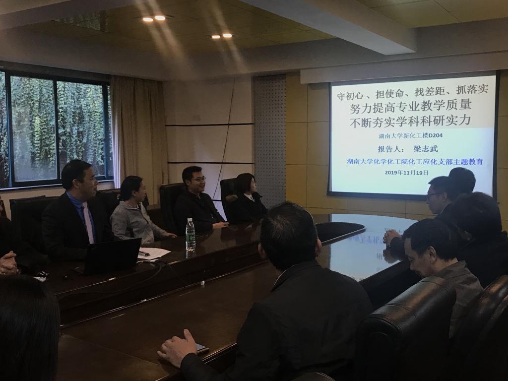 党支部全体同志在学院新楼D区204会议室开展了党政学习交流。会上,副院长梁志武教授作了《守初心、担使命、找差距、抓落实-努力提高专业教学质量,不断夯实学科科研实力》的专题党课。梁志武带领大家一起回顾了学院发展历史,以及化工应化专业的发展现状,并指出正是由于一代代老师和前辈们 “不忘初心”的努力和“牢记使命”的责任感,才有了我们现在tyc1286太阳成集团良好的发展局面。当下,无论是学院还是化工应化专业的发展都到了一个关键时期,作为新时代的大学教师,更应当不忘初心,牢记使命,努力提高自身教学水平,不断夯实自身科学研究能力。