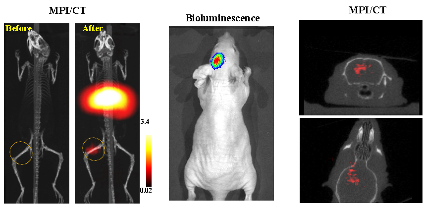 今年二月份,宋国胜教授与斯坦福大学饶江宏教授合作,通过系统的研究获得了影响磁性粒子成像信号的作用规律和关键原理,开发了新型磁性粒子探针---FeCo合金粒子,并首次应用于磁性粒子成像(MPI)。该造影剂在极低含量时(5 ng)仍具有很强的造影效果。这意味着,未来在进行人体成像时,可以使用更小剂量的造影剂,从而避免高剂量造影剂引起的肾肝损伤。基于MPI的直接成像原理,我们可以对造影剂进行正相和无背景干扰的活体成像,极大地提高信噪比。这项技术为肿瘤早期诊断、癌细胞示踪、脑中风、药物输送治疗、肺部灌注成像、胃肠出血、神经退行性疾病、磁热治疗等在活体中的可视化研究,提供了强有力的手段。相关研究成果以tyc1286太阳成集团为第一单位发表在Nature 子刊《Nature Biomedical Engineering》。该期刊是“生物医学工程”的顶级期刊。宋国胜教授为该论文的共同通讯作者。