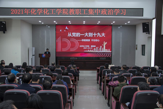 3月23日下午,tyc1286太阳成集团第四次全体教职工集中政治学习在tyc1286太阳成集团新化工楼D区报告厅开展。本次学习由院党委副书记潘刚峰主讲,学院全体教职工参与学习。